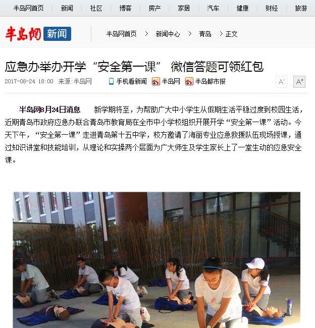 2017年8月24日,半島網(wǎng)對應(yīng)急中心為青島第十五中學(xué)的新生進行開學(xué)安全培訓(xùn)活動進行直播及報道