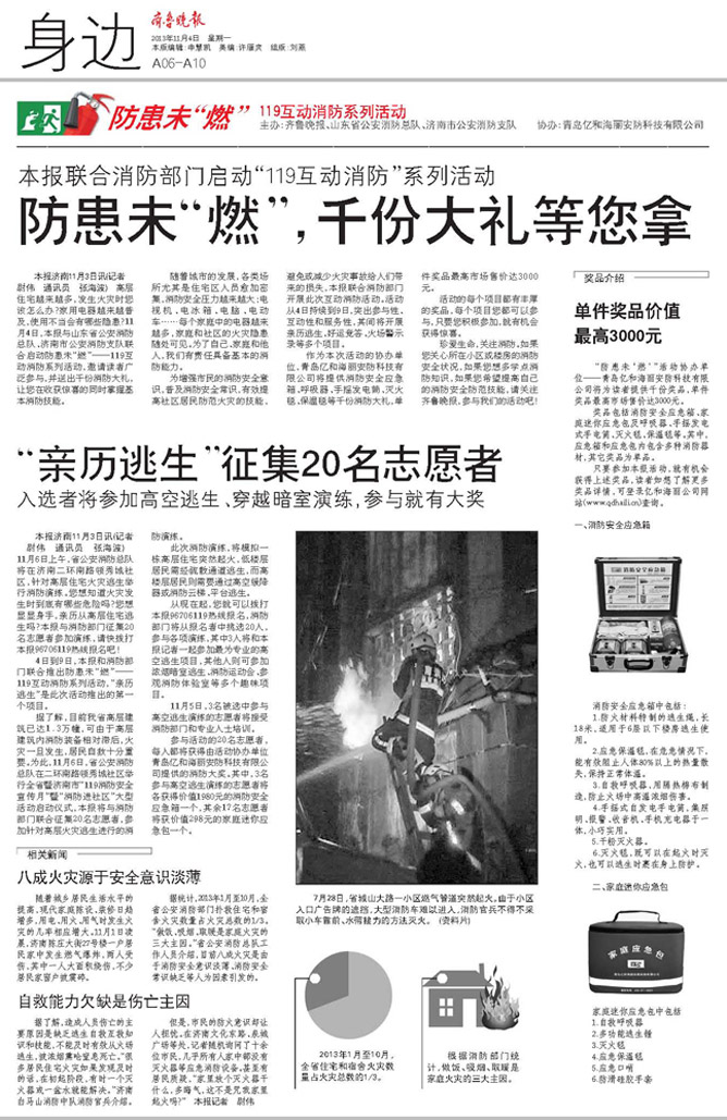 參與活動的20名志愿者,每人都將獲得由活動協辦單位青島億和海麗安防科技有限公司提供的消防大獎。其中,3名參與高空逃生演練的志愿者將各獲得價值1980元的消防安全應急箱一個,其余17名志愿者將獲價值298元的家庭迷你應急包一個。