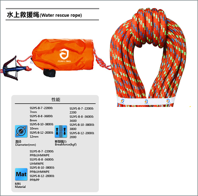 水上救生包內繩索采用鮮艷的橘紅色或橘黃色亮色系為主,具有反光和夜光功能、高亮和警示功能。